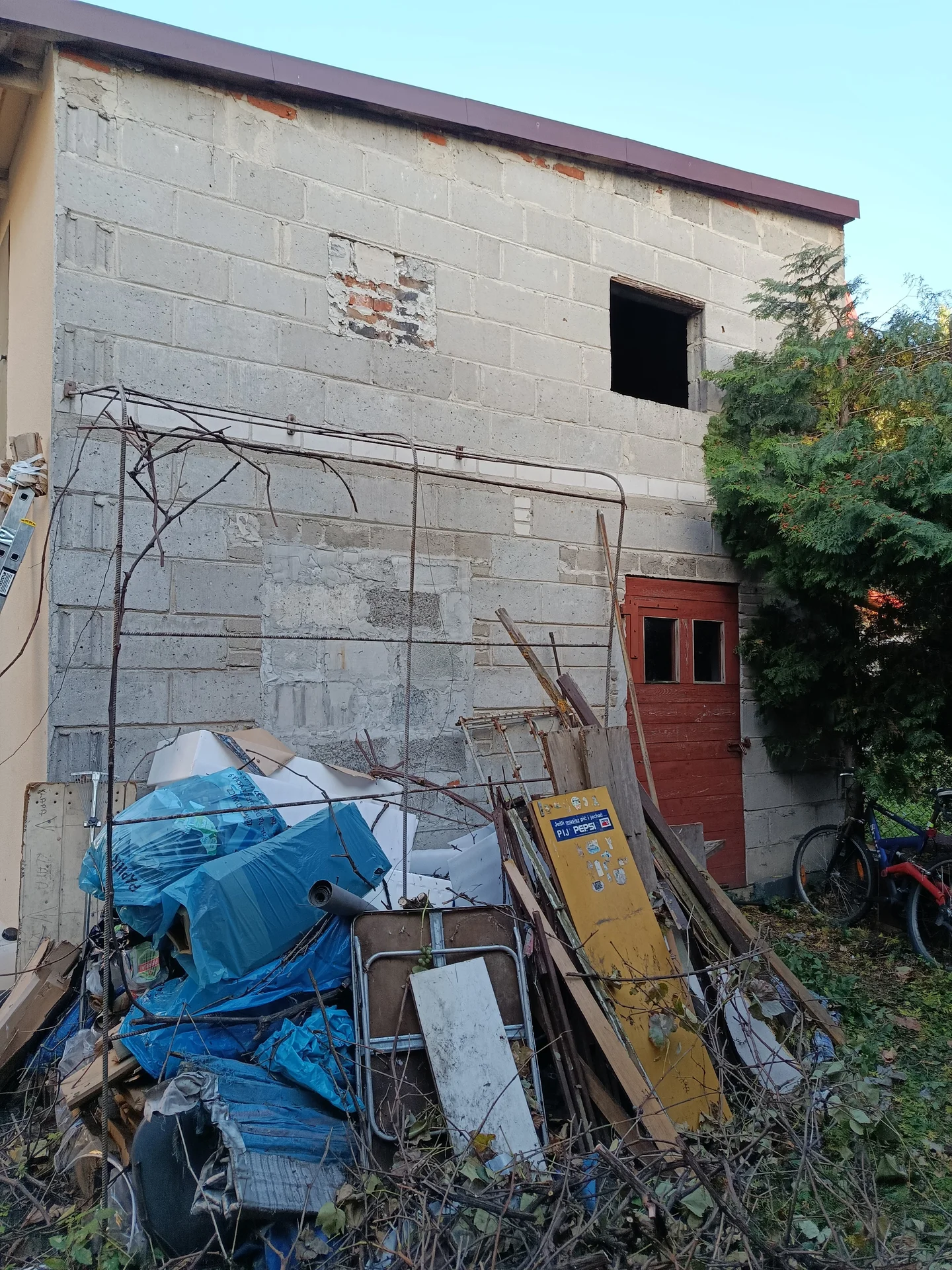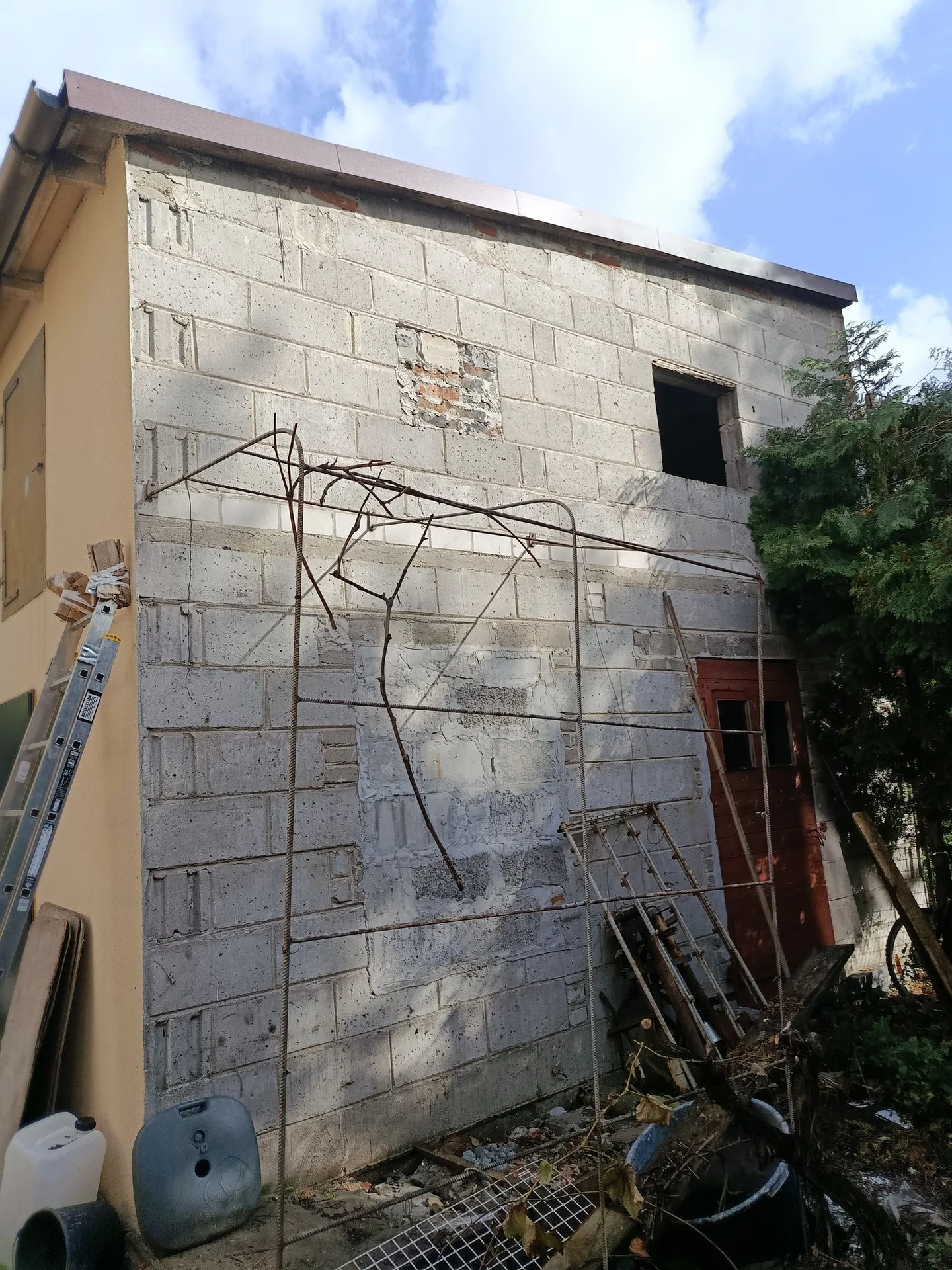 Budynek gospodarczy to solidna, wolnostojąca bryła z bloczków betonowych, aktualnie bez przyłącza elektrycznego. Południowa ściana, którą widać na załączonym zdjęciu, to surowy beton z charakterystyczną fakturą bloczków - estetycznie daleka od nowoczesnych elewacji, ale technicznie dobra baza do montażu stalowej konstrukcji konstrukcji pod panele.
